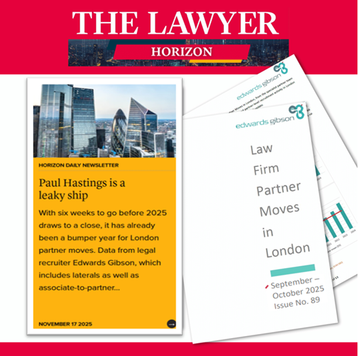 Edwards Gibson is thrilled to see its market-leading research prominently featured in The Lawyer Horizon Newsletter article, “Paul Hastings is a leaky ship”. The piece, written by Margaret Taylor, offers a detailed analysis of partner moves in London and extensively draws on Edwards Gibson’s data to illustrate the scale of movement in 2025 to date.