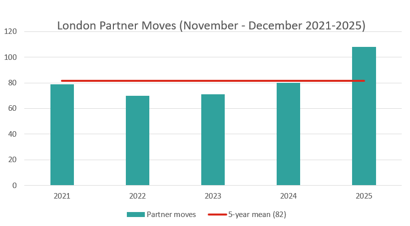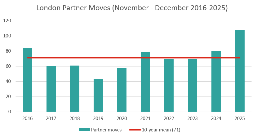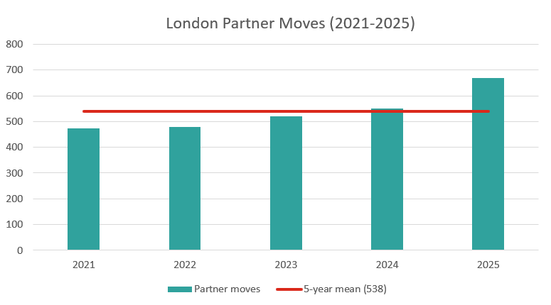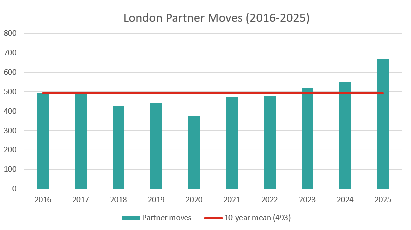 There were 668 partner moves announced in 2025. Our records go back to 2007, and this is by far the highest number ever recorded in a single year – 21% up on the previous record - 551 - which was set last year, and 24% and 36% up on the cumulative five and ten-year averages respectively.