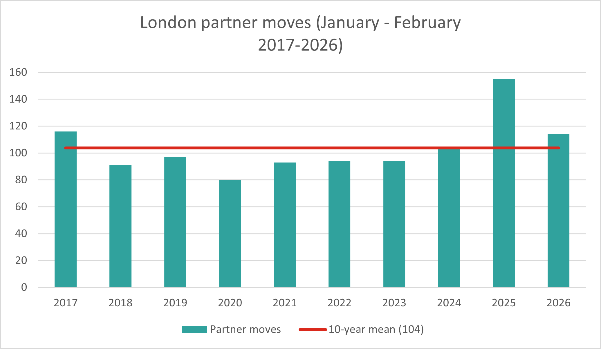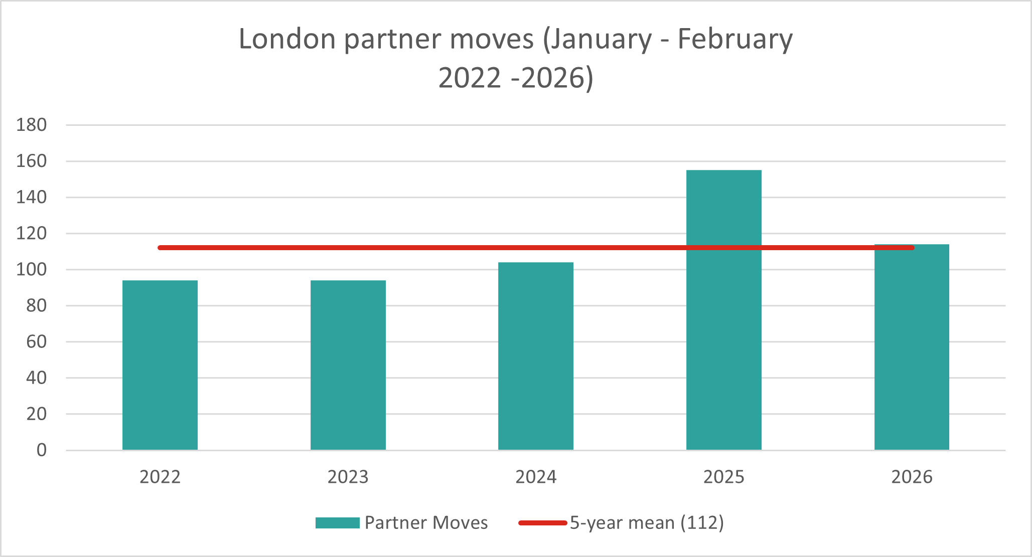 At first glance, the figures suggest a sharp slowdown in partner recruitment. However, this impression is misleading. While there has indeed been a substantial drop against last year’s extraordinary numbers, hiring activity in the first two months of 2026 remained close to record levels by historical standards — 2% above the cumulative five‑year average (112) and 10% up on the ten‑year average (104).